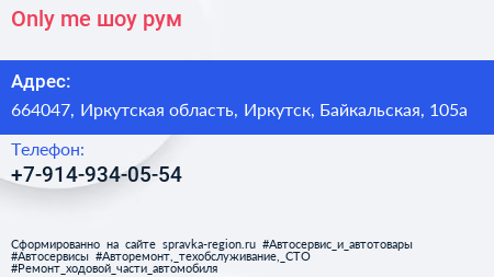 Only me, шоу-рум по адресу 664047, Иркутская область, Иркутск, Байкальская, 105а в дальнейшем Организация, размещена в следующих категориях:
