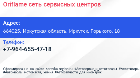 Oriflame, сеть сервисных центров по адресу 664025, Иркутская область, Иркутск, Горького, 18 в дальнейшем Организация, размещена в следующих категориях: