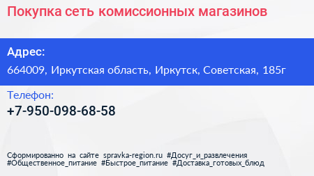 Покупка, сеть комиссионных магазинов по адресу 664009, Иркутская область, Иркутск, Советская, 185г в дальнейшем Организация, размещена в следующих категориях: