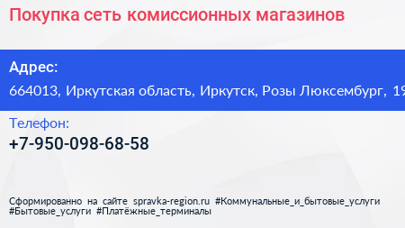 Покупка, сеть комиссионных магазинов по адресу 664013, Иркутская область, Иркутск, Розы Люксембург, 19 в дальнейшем Организация, размещена в следующих категориях:
