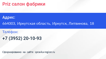 Priz, салон фабрики по адресу 664003, Иркутская область, Иркутск, Литвинова, 18 в дальнейшем Организация, размещена в следующих категориях: