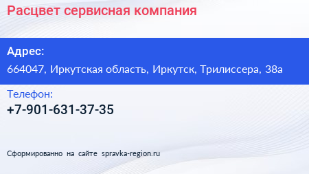 Расцвет, сервисная компания по адресу 664047, Иркутская область, Иркутск, Трилиссера, 38а в дальнейшем Организация, размещена в следующих категориях: