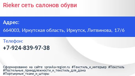 Rieker, сеть салонов обуви по адресу 664003, Иркутская область, Иркутск, Литвинова, 17/6 в дальнейшем Организация, размещена в следующих категориях: