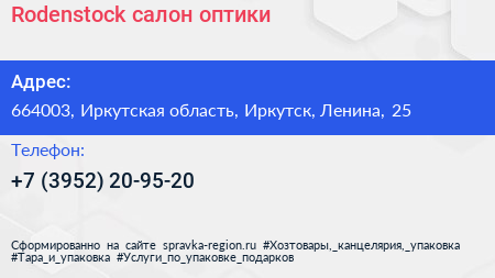 Rodenstock, салон оптики по адресу 664003, Иркутская область, Иркутск, Ленина, 25 в дальнейшем Организация, размещена в следующих категориях: