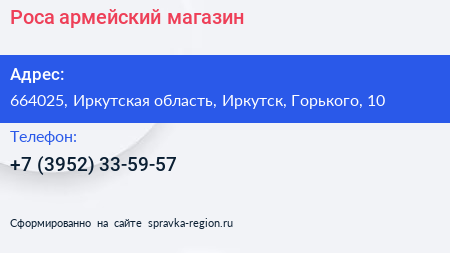 Роса, армейский магазин по адресу 664025, Иркутская область, Иркутск, Горького, 10 в дальнейшем Организация, размещена в следующих категориях: