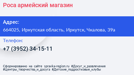 Роса, армейский магазин по адресу 664025, Иркутская область, Иркутск, Чкалова, 39а в дальнейшем Организация, размещена в следующих категориях: