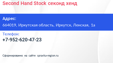 Second Hand & Stock, секонд-хенд по адресу 664019, Иркутская область, Иркутск, Ленская, 1а в дальнейшем Организация, размещена в следующих категориях: