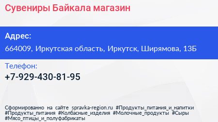 Сувениры Байкала, магазин по адресу 664009, Иркутская область, Иркутск, Ширямова, 13Б в дальнейшем Организация, размещена в следующих категориях:
