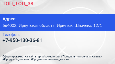 ТОП_ТОП_38 по адресу 664002, Иркутская область, Иркутск, Шпачека, 12/1 в дальнейшем Организация, размещена в следующих категориях: