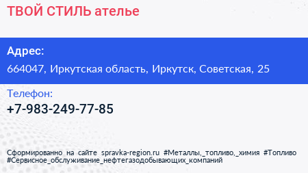 ТВОЙ СТИЛЬ, ателье по адресу 664047, Иркутская область, Иркутск, Советская, 25 в дальнейшем Организация, размещена в следующих категориях: