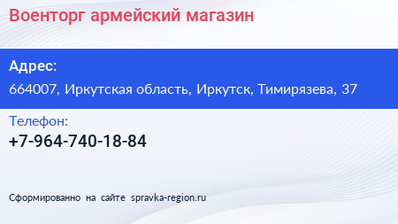 Военторг, армейский магазин по адресу 664007, Иркутская область, Иркутск, Тимирязева, 37 в дальнейшем Организация, размещена в следующих категориях: