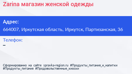Zarina, магазин женской одежды по адресу 664007, Иркутская область, Иркутск, Партизанская, 36 в дальнейшем Организация, размещена в следующих категориях: