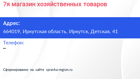 7я, магазин хозяйственных товаров по адресу 664019, Иркутская область, Иркутск, Детская, 41 в дальнейшем Организация, размещена в следующих категориях: