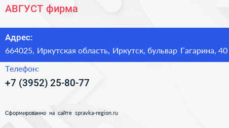 АВГУСТ, фирма по адресу 664025, Иркутская область, Иркутск, бульвар Гагарина, 40 в дальнейшем Организация, размещена в следующих категориях: