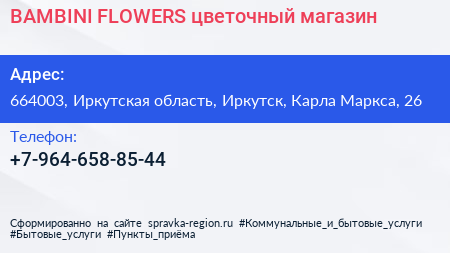 BAMBINI FLOWERS, цветочный магазин по адресу 664003, Иркутская область, Иркутск, Карла Маркса, 26 в дальнейшем Организация, размещена в следующих категориях: