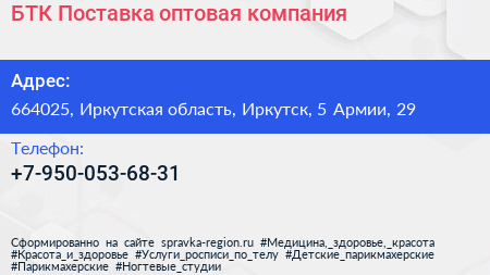 БТК Поставка, оптовая компания по адресу 664025, Иркутская область, Иркутск, 5 Армии, 29 в дальнейшем Организация, размещена в следующих категориях: