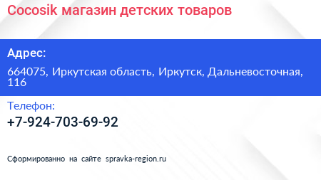 Cocosik, магазин детских товаров по адресу 664075, Иркутская область, Иркутск, Дальневосточная, 116 в дальнейшем Организация, размещена в следующих категориях: