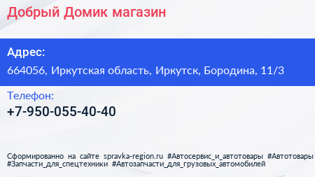 Добрый Домик, магазин по адресу 664056, Иркутская область, Иркутск, Бородина, 11/3 в дальнейшем Организация, размещена в следующих категориях: