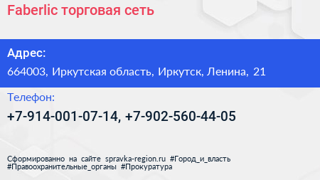 Faberlic, торговая сеть по адресу 664003, Иркутская область, Иркутск, Ленина, 21 в дальнейшем Организация, размещена в следующих категориях: