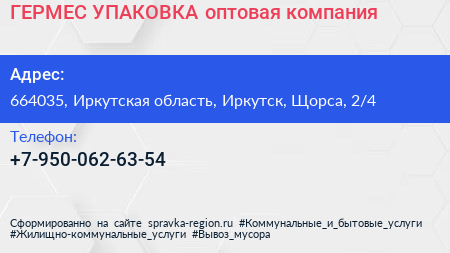 ГЕРМЕС-УПАКОВКА, оптовая компания по адресу 664035, Иркутская область, Иркутск, Щорса, 2/4 в дальнейшем Организация, размещена в следующих категориях: