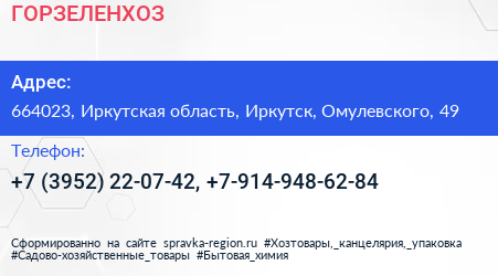 ГОРЗЕЛЕНХОЗ по адресу 664023, Иркутская область, Иркутск, Омулевского, 49 в дальнейшем Организация, размещена в следующих категориях: