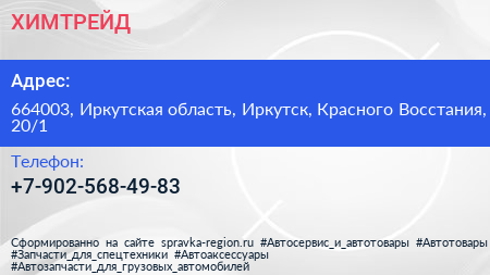 ХИМТРЕЙД по адресу 664003, Иркутская область, Иркутск, Красного Восстания, 20/1 в дальнейшем Организация, размещена в следующих категориях: