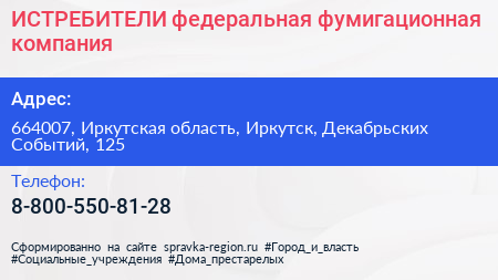 ИСТРЕБИТЕЛИ, федеральная фумигационная компания по адресу 664007, Иркутская область, Иркутск, Декабрьских Событий, 125 в дальнейшем Организация, размещена в следующих категориях:
