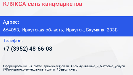 КЛЯКСА, сеть канцмаркетов по адресу 664053, Иркутская область, Иркутск, Баумана, 233Б в дальнейшем Организация, размещена в следующих категориях: