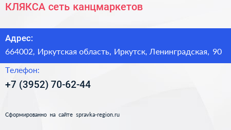 КЛЯКСА, сеть канцмаркетов по адресу 664002, Иркутская область, Иркутск, Ленинградская, 90 в дальнейшем Организация, размещена в следующих категориях:
