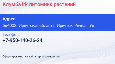 Клумба.irk, питомник растений по адресу 664002, Иркутская область, Иркутск, Речная, 96 в дальнейшем Организация, размещена в следующих категориях: