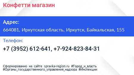 Конфетти, магазин по адресу 664081, Иркутская область, Иркутск, Байкальская, 155 в дальнейшем Организация, размещена в следующих категориях: