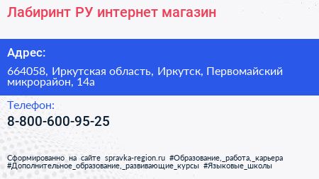 Лабиринт.РУ, интернет-магазин по адресу 664058, Иркутская область, Иркутск, Первомайский микрорайон, 14а в дальнейшем Организация, размещена в следующих категориях: