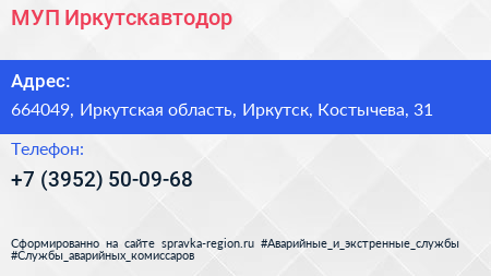 МУП Иркутскавтодор по адресу 664049, Иркутская область, Иркутск, Костычева, 31 в дальнейшем Организация, размещена в следующих категориях: