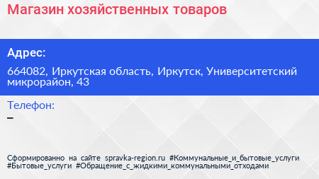Магазин хозяйственных товаров по адресу 664082, Иркутская область, Иркутск, Университетский микрорайон, 43 в дальнейшем Организация, размещена в следующих категориях: