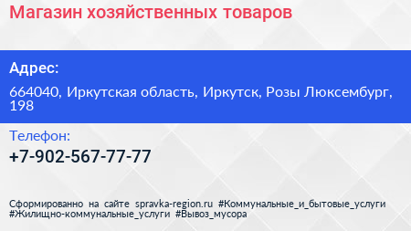 Магазин хозяйственных товаров по адресу 664040, Иркутская область, Иркутск, Розы Люксембург, 198 в дальнейшем Организация, размещена в следующих категориях: