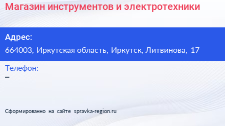 Магазин инструментов и электротехники по адресу 664003, Иркутская область, Иркутск, Литвинова, 17 в дальнейшем Организация, размещена в следующих категориях: