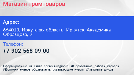 Магазин промтоваров по адресу 664013, Иркутская область, Иркутск, Академика Образцова, 7 в дальнейшем Организация, размещена в следующих категориях: