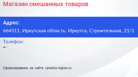 Магазин смешанных товаров по адресу 664511, Иркутская область, Иркутск, Строительная, 21/1 в дальнейшем Организация, размещена в следующих категориях: