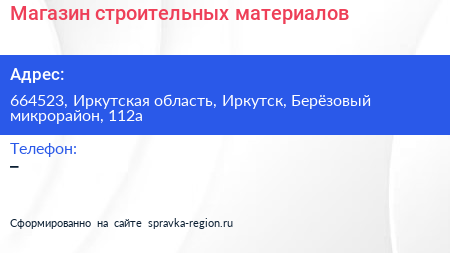 Магазин строительных материалов по адресу 664523, Иркутская область, Иркутск, Берёзовый микрорайон, 112а в дальнейшем Организация, размещена в следующих категориях: