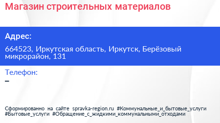 Магазин строительных материалов по адресу 664523, Иркутская область, Иркутск, Берёзовый микрорайон, 131 в дальнейшем Организация, размещена в следующих категориях: