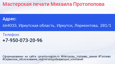 Мастерская печати Михаила Протопопова по адресу 664033, Иркутская область, Иркутск, Лермонтова, 281/1 в дальнейшем Организация, размещена в следующих категориях: