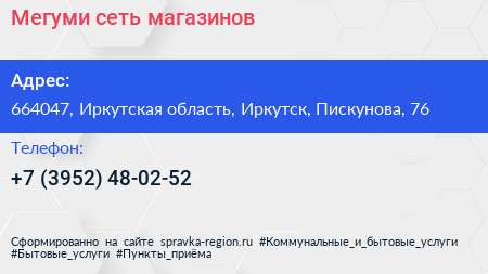 Мегуми, сеть магазинов по адресу 664047, Иркутская область, Иркутск, Пискунова, 76 в дальнейшем Организация, размещена в следующих категориях: