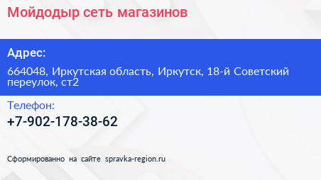 Мойдодыр, сеть магазинов по адресу 664048, Иркутская область, Иркутск, 18-й Советский переулок, ст2 в дальнейшем Организация, размещена в следующих категориях: