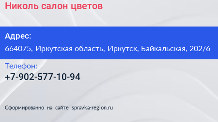 Николь, салон цветов по адресу 664075, Иркутская область, Иркутск, Байкальская, 202/6 в дальнейшем Организация, размещена в следующих категориях: