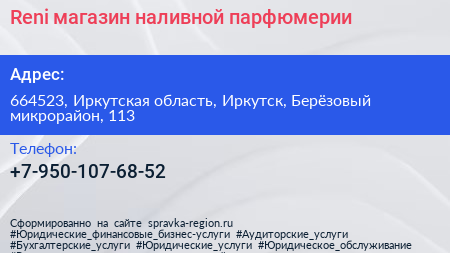 Reni, магазин наливной парфюмерии по адресу 664523, Иркутская область, Иркутск, Берёзовый микрорайон, 113 в дальнейшем Организация, размещена в следующих категориях: