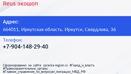 Reus, экошоп по адресу 664011, Иркутская область, Иркутск, Свердлова, 36 в дальнейшем Организация, размещена в следующих категориях: