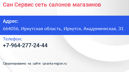 Сан-Сервис, сеть салонов-магазинов по адресу 664056, Иркутская область, Иркутск, Академическая, 31 в дальнейшем Организация, размещена в следующих категориях: