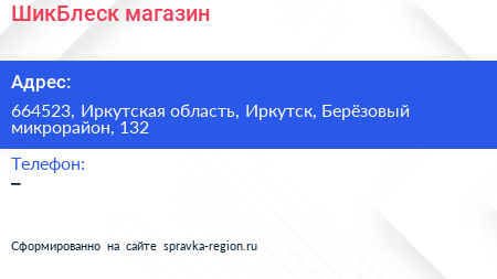 ШикБлеск, магазин по адресу 664523, Иркутская область, Иркутск, Берёзовый микрорайон, 132 в дальнейшем Организация, размещена в следующих категориях: