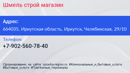 Шмель-строй, магазин по адресу 664035, Иркутская область, Иркутск, Челябинская, 29/10 в дальнейшем Организация, размещена в следующих категориях: