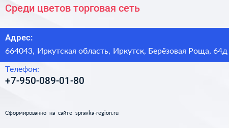 Среди цветов, торговая сеть по адресу 664043, Иркутская область, Иркутск, Берёзовая Роща, 64д в дальнейшем Организация, размещена в следующих категориях: